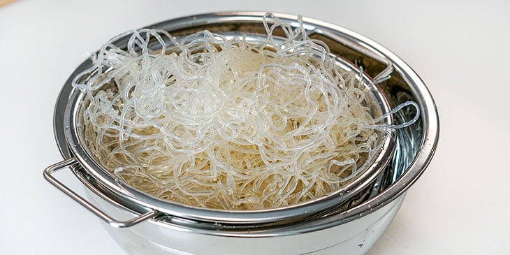 Remove the kelp noodles from the packaging and drain from any liquid they were submerged in. Toss the liquid and rinse the noodles out under cold water to gently break them up.